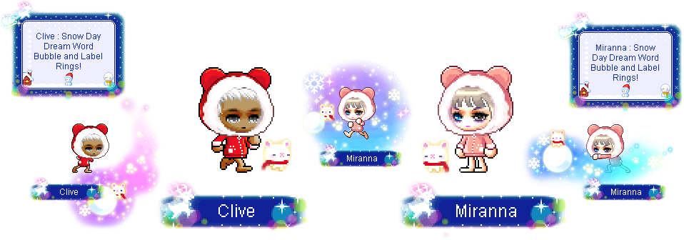 克莱夫:红色小熊冬季连帽衫、红色小熊冬季羽绒服、小熊玩偶、雪日梦境标签戒指和雪日梦境对话框戒指。