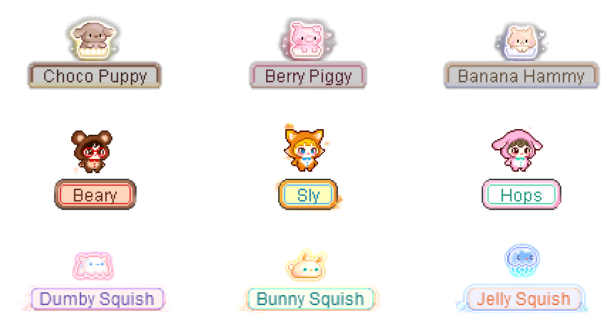 - Dream Luna品质的Choco Puppy、Berry Piggy、Banana Hammy、Beary、Sly、Hops、Dumby Squish、Bunny Squish和Jelly Squish,90 天宠物。