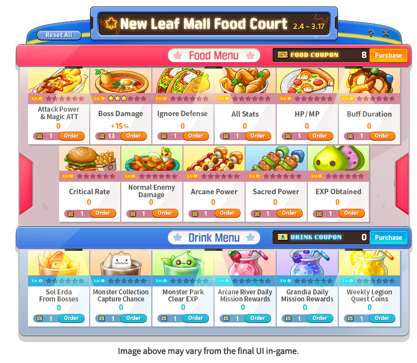 欢迎来到美食广场!查看新叶购物中心特别菜单上的内容,获取活动支持来支持您的训练或加快 Boss 跑步速度。根据您想要如何提升自己的游戏风格,调整您的美食和饮料菜单技能点数。