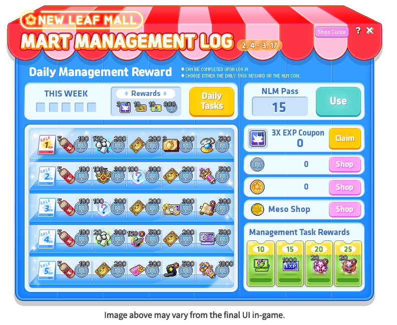 每天都来领取你的奖励吧!登录并帮助超市管理员获取新叶商场代币、经验值优惠券和各种额外奖励。更棒的是,我们还在发放食物和饮料优惠券,你可以在新叶商场美食广场兑换成技能点数,获得更多额外奖励!