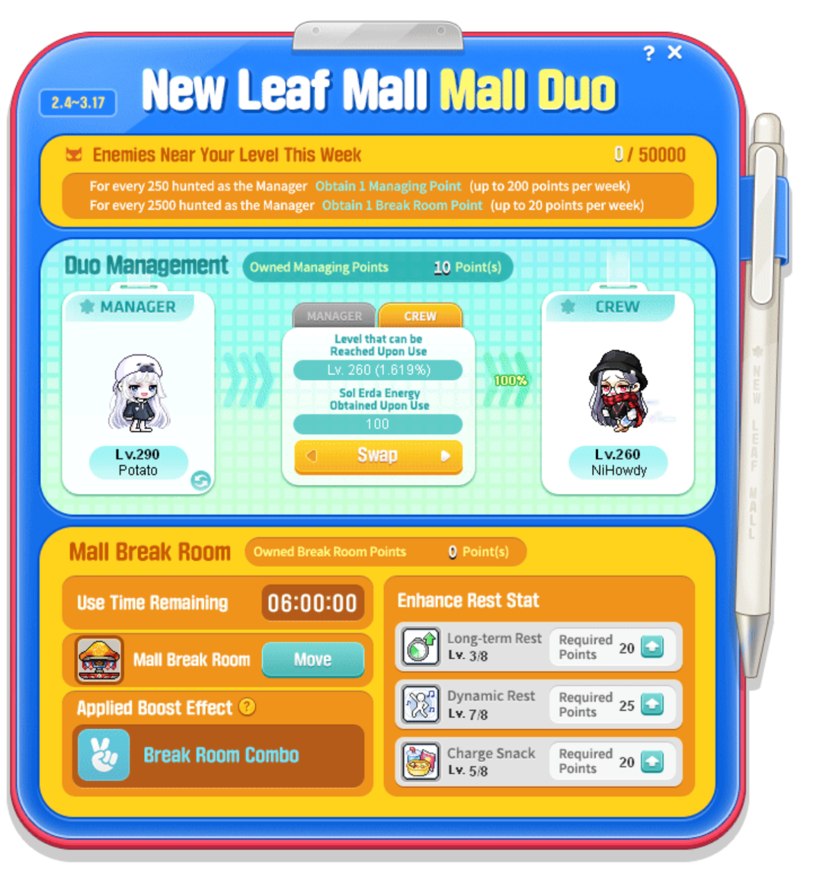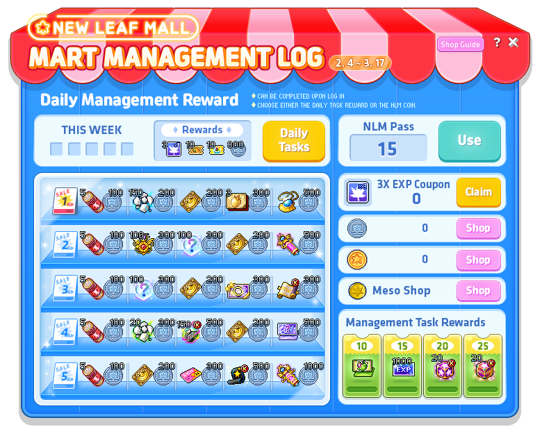 - 错过了签到?购买价值 3,000 枫叶点的New Leaf Mall Pass,即可完成一次每日管理并获得奖励。