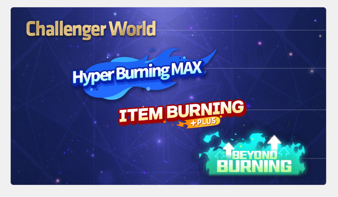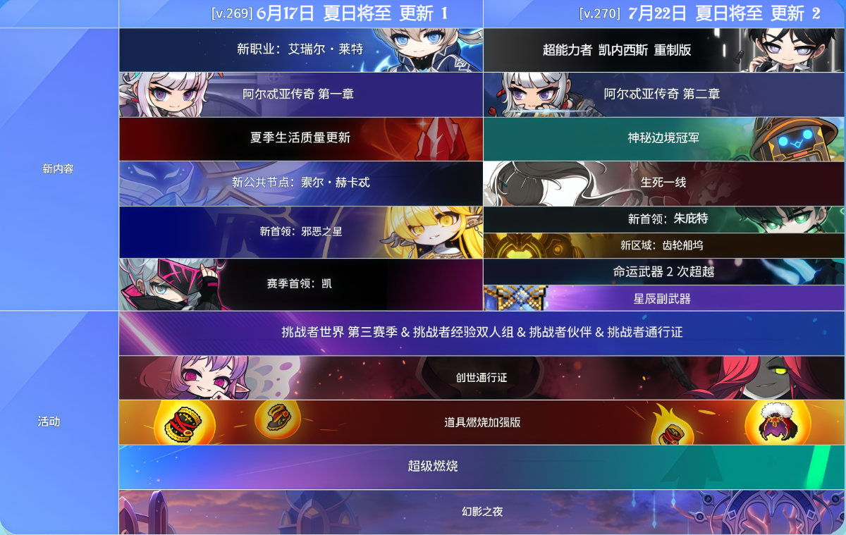 除此之外,我们还准备了丰富的活动来支持各位快速成长。今年夏天,“挑战者世界”、“0-260超级燃烧MAX”以及“260-270超越燃烧”将继续进行,同时“装备燃烧”也将以全新升级的“装备燃烧PLUS”形式回归。请充分利用这些丰厚的成长活动,更轻松地培养新职业和强力角色吧!
